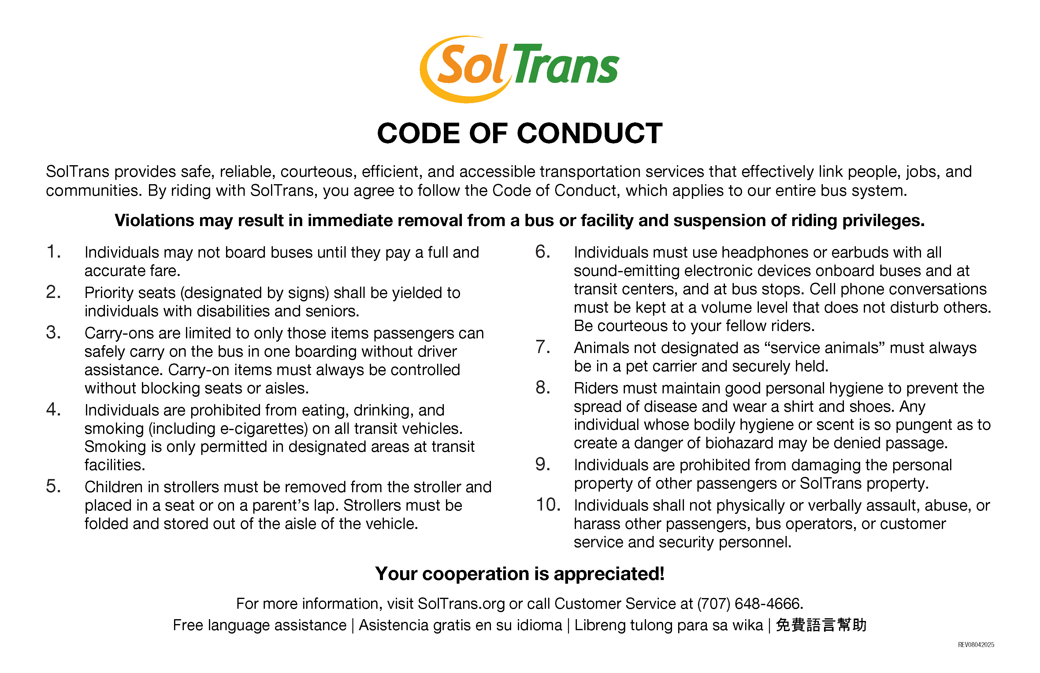 SolTrans has adopted a Code of Conduct policy. SolTrans delivers safe, reliable and efficient transportation services that link people, jobs, and our communities. By riding with SolTrans, you agree to follow the Code of Conduct, which applies to our entire bus system. Violations may result in immediate removal from a bus or facility and suspension of riding privileges.