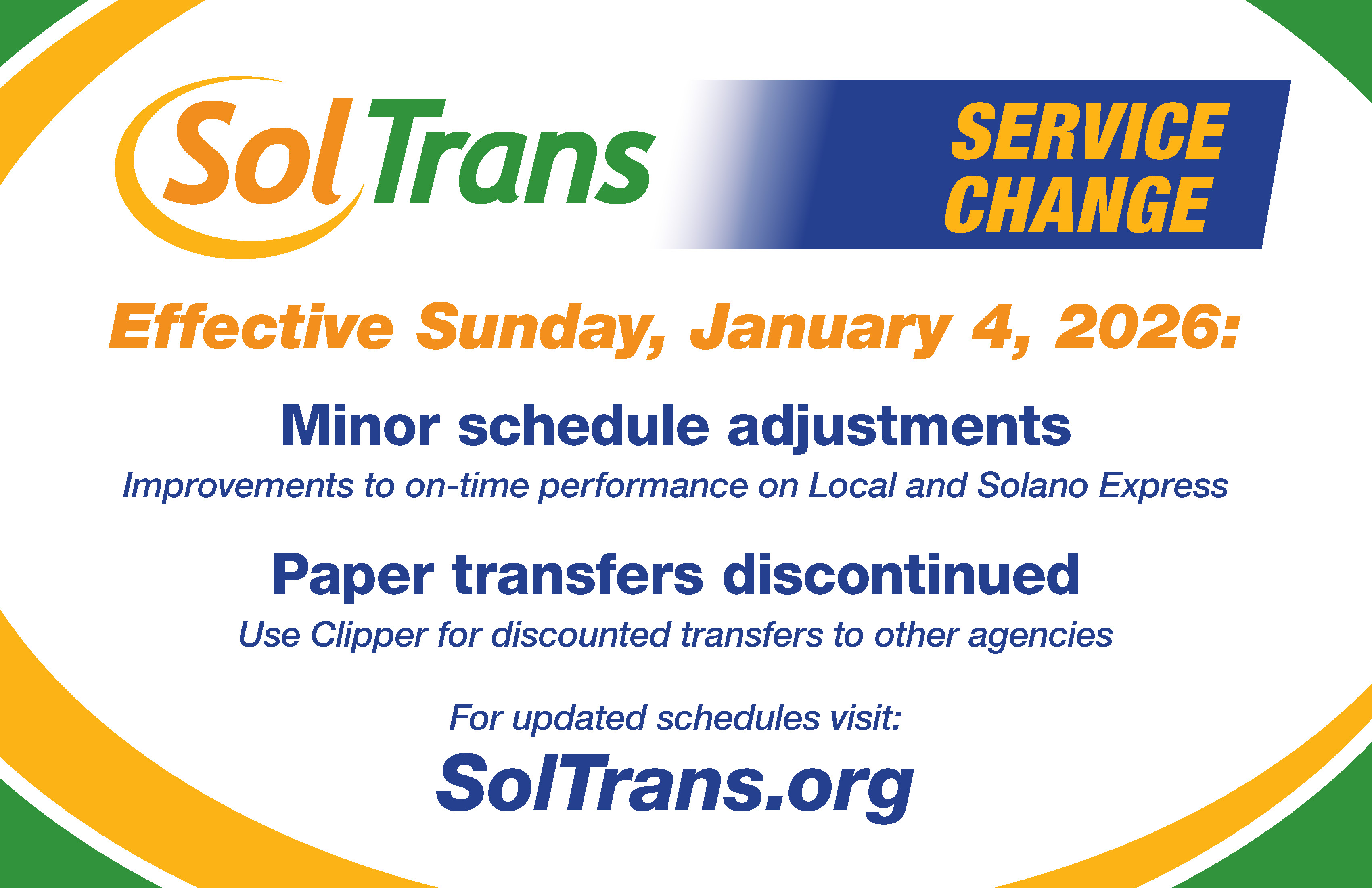 SolTrans will implement minor schedule changes to Express Lines and Local Routes on Sunday, January 4, 2026.