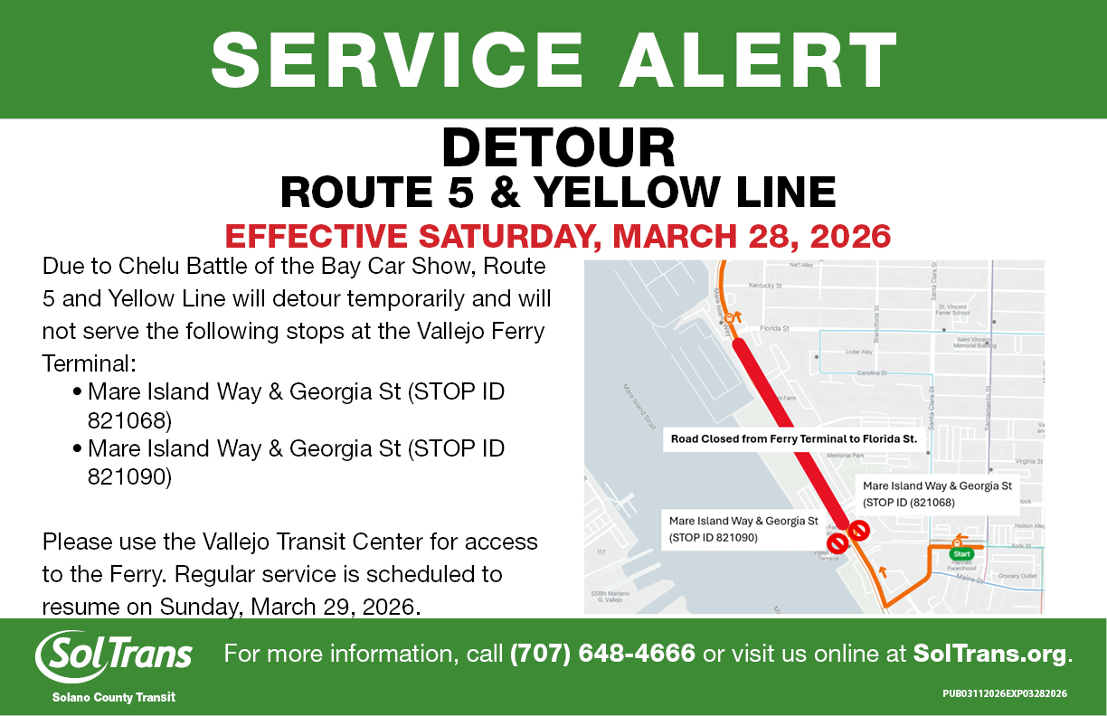 Due to Chelu Battle of the Bay Car Show, Route 5 and Yellow Line will detour temporarily and will not serve the following stops at the Vallejo Ferry Terminal:
